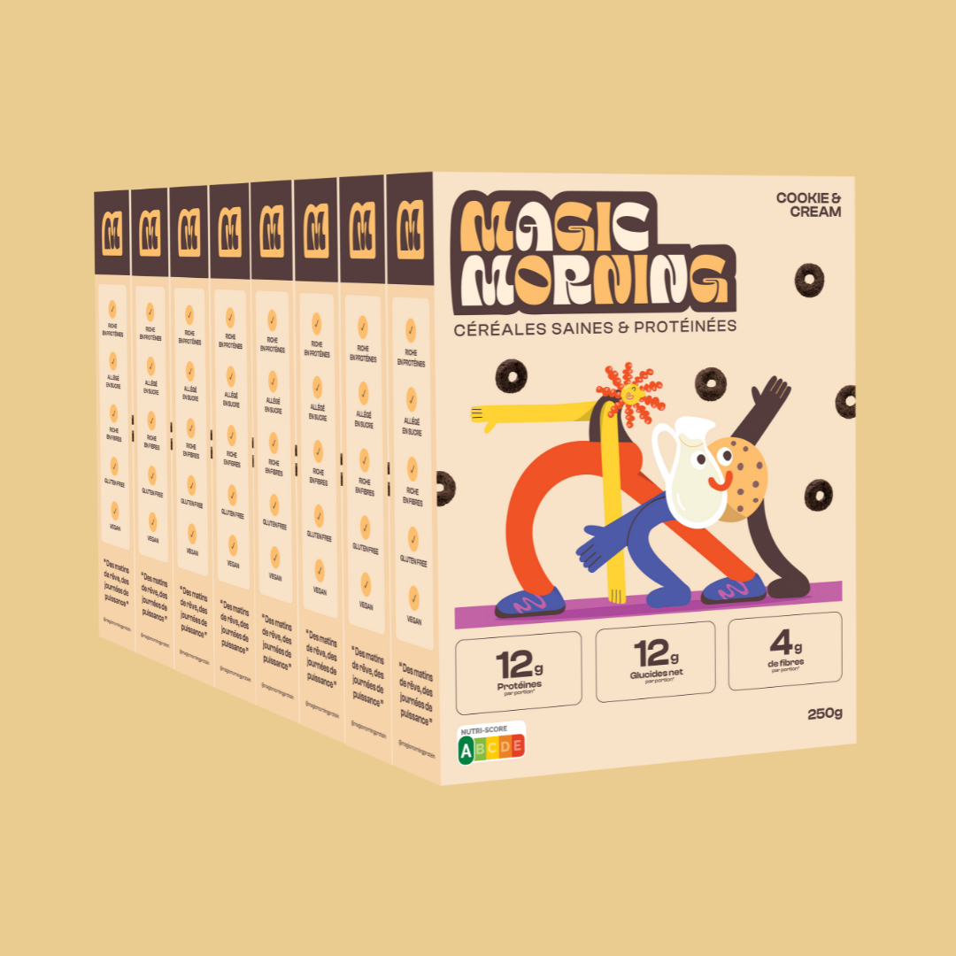 Magic Morning ce sont des céréales saines et protéinées qui s’adressent à tous ceux qui recherchent une alimentation équilibrée. Que tu sois nostalgique des céréales de ton enfance ou à la recherche d’un petit déjeuner gourmand et rapide, Magic Morning est fait pour toi.